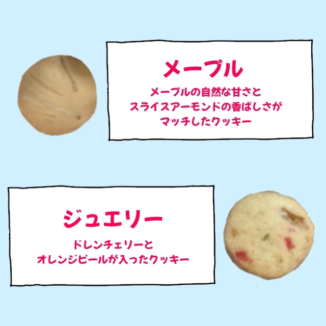 ミックスクッキーは、バタークッキー、チョコBOXクッキー、ジュエリークッキー、メープルクッキーの4種類です。